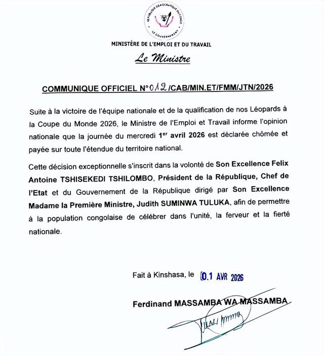 如何庆祝晋级世界杯?4月1日,民主刚果劳动与就业部发布公告: