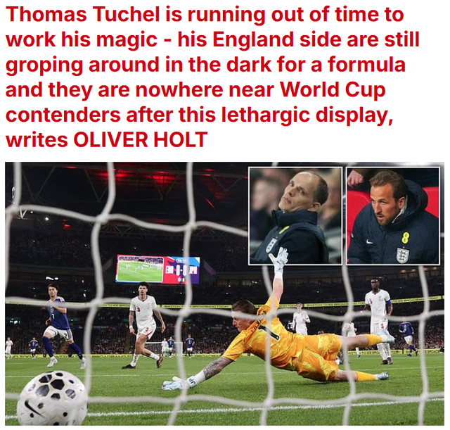《每日邮报》的批评相对柔和。名记奥利弗-霍尔特撰文指出,留给英格兰主帅图赫尔的时间不多了。0-1负于日本,这支英格兰仍在黑暗中苦苦摸索,暮气沉沉,世界杯争冠?相去甚远。